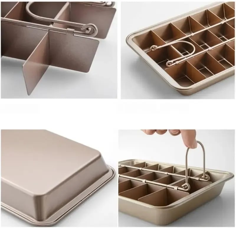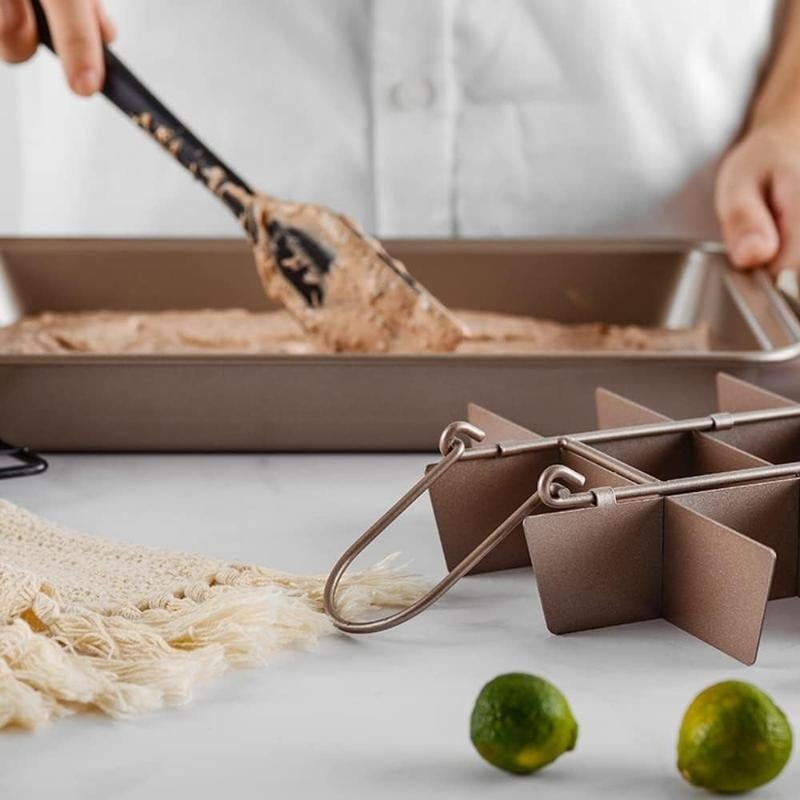 Effortlessly bake 18 evenly sized brownies in one pan. No knife needed—just lift out the divider, and your treats are ready to serve.