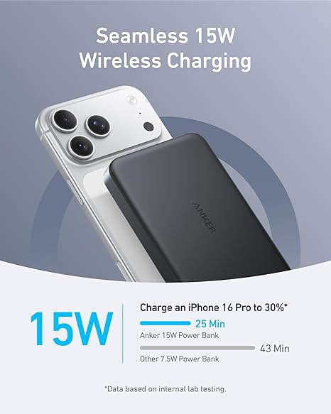 22.5W ULTRA FAST CHARGING - Unleash the next generation of charging speed! 22.5W wired super charging charges devices twice as fast, while 15W wireless charging effortlessly powers Qi compatible devices. Thanks to PD20W bi-directional charging, the power bank is fully charged in just 1 hour. Perfect for iPhones, Android devices and AirPods.